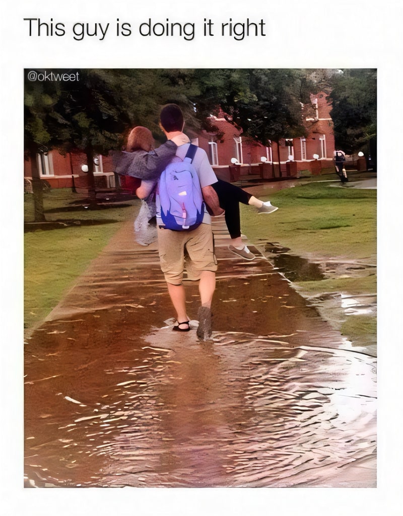He didn’t hesitate. Water covered the path, muddy and cold, but she looked at him with that half-smile. Without a word, he scooped her up, cradled in his arms like a scene from an old film, and walked through. She laughed, holding on tight. That’s love—quiet, simple, soaked in effort.