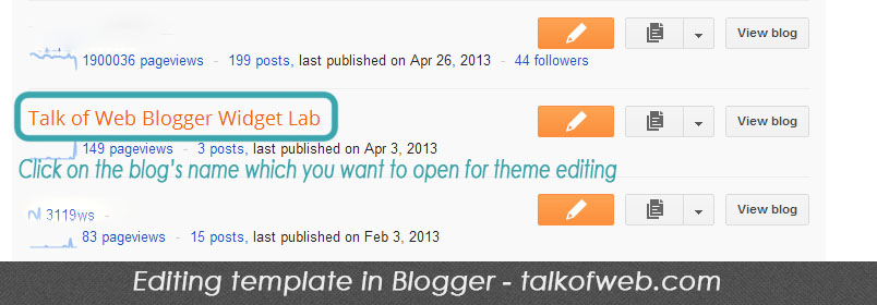 2- After you are logged in, select the blog which you want for theme editing. Click the name of the blog. You will be taken to the dashboard of that specific blog.